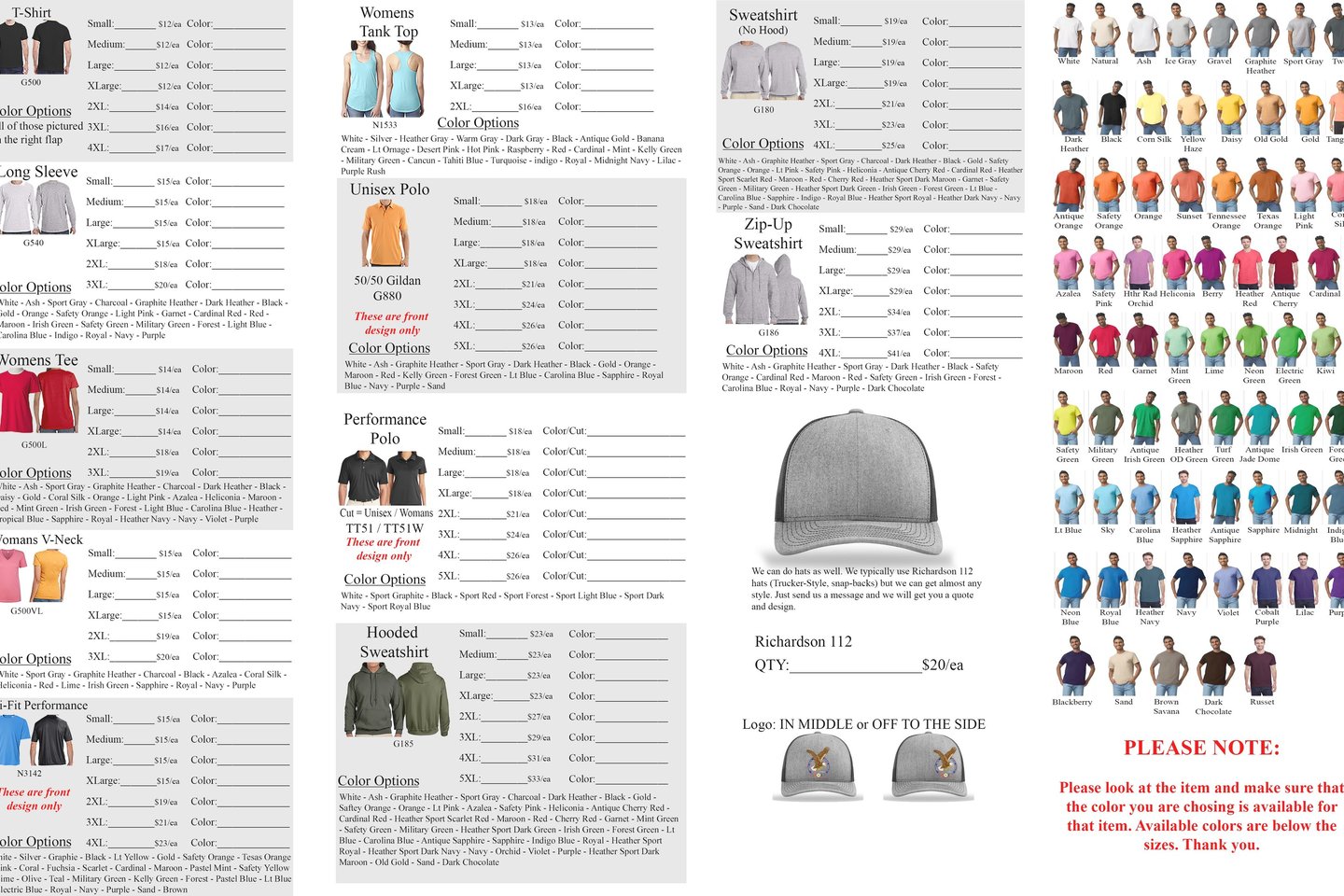 We can typically get any type of apparel, if what you want is not on here just ask.